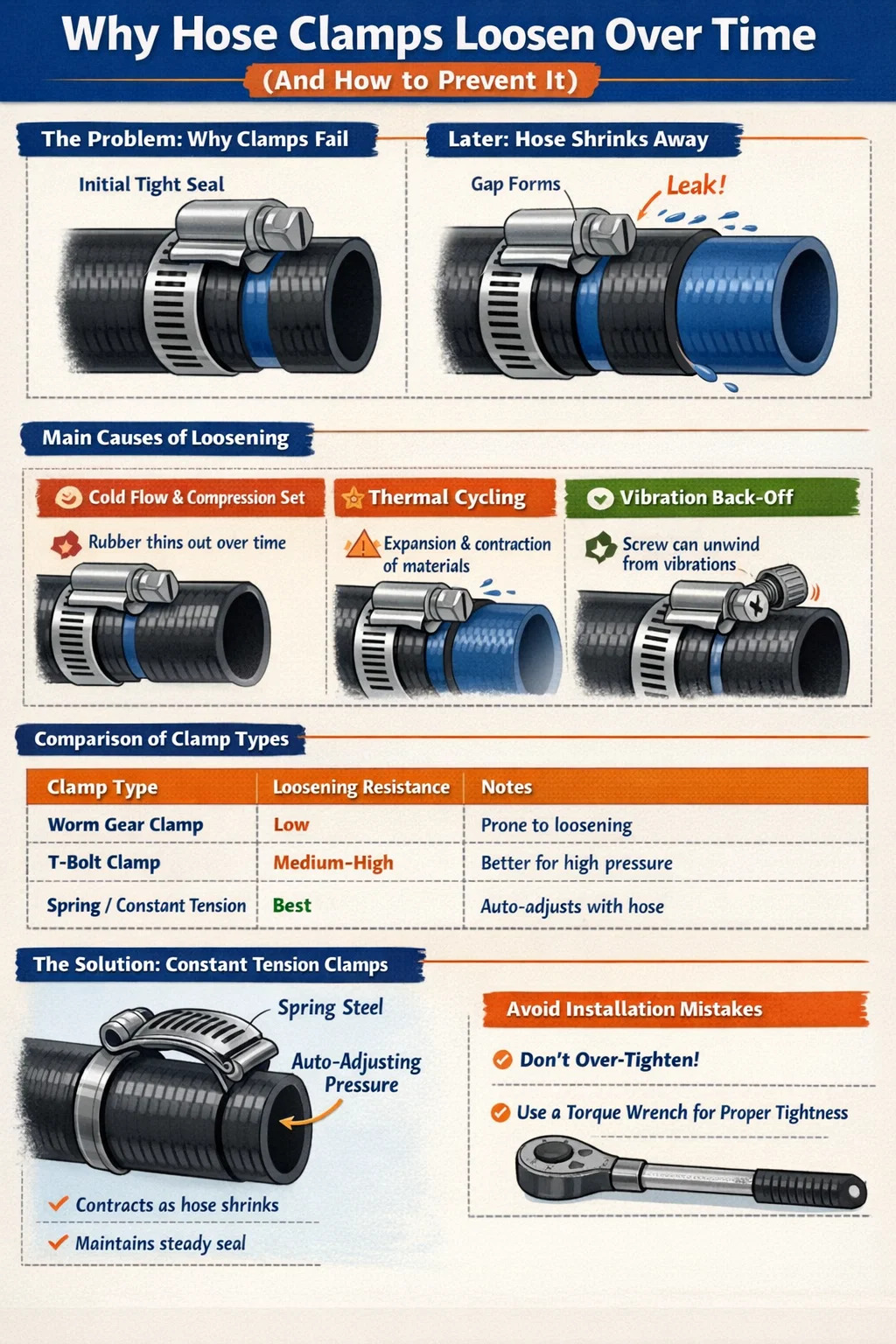 Поскольку ослабление в основном вызвано изменением размера шланга (усадкой из-за холодного течения или термического сжатия), единственным постоянным решением является хомут, который меняет размер вместе со шлангом. Вот почему производители автомобилей почти исключительно используют на шлангах радиатора пружинные хомуты (также называемые хомутами постоянного натяжения), а не червячные передачи.