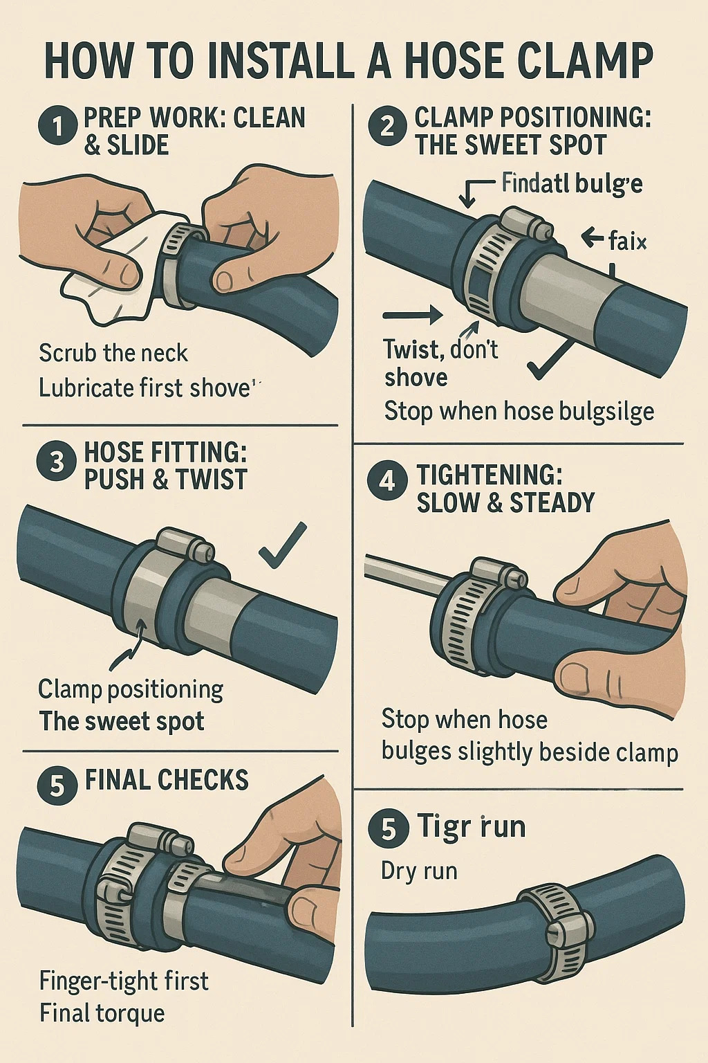 При необходимости подтяните повторно: некоторые шланги оседают после циклов нагрева. Проверьте зажимы после первого использования.