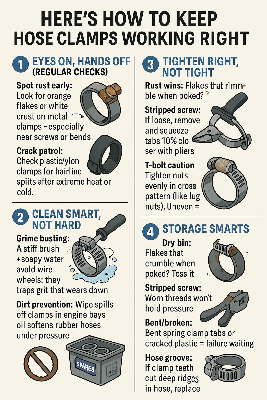Правило червячной передачи: затяните винт пальцами, затем отверткой на ¼ оборота – предотвращает утечку, не сдавливая шланги.