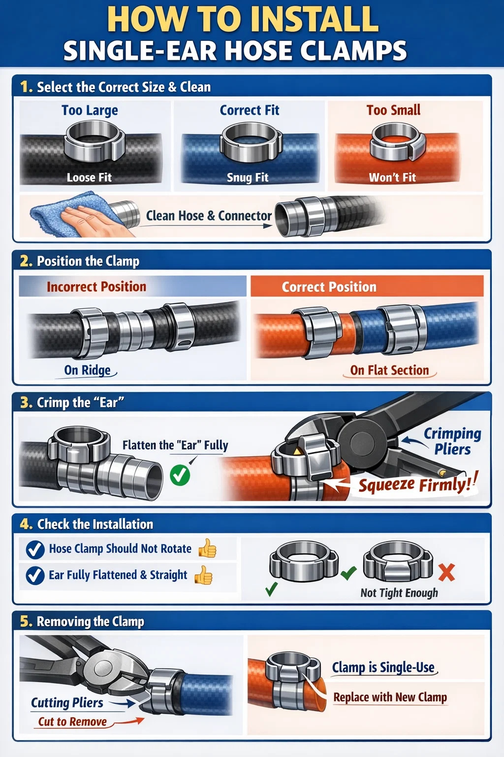 Хомуты для шлангов с одним ушком очень надежны и обеспечивают отличную герметизацию после установки. В основном они используются в соединениях труб, которые не требуют частой разборки, например, в автомобильных топливопроводах или бытовых водопроводных и газовых трубах. Установить их не так просто, как обычные винтовые зажимы; это требует немного изящества.