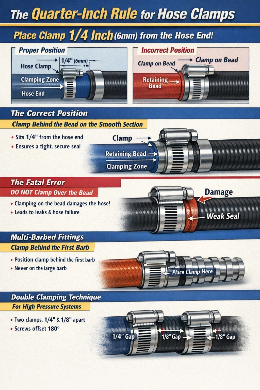 При установке двух хомутов на одном конце шланга первый хомут размещается 1/4 дюйма от края шланга , как и при стандартной установке. Второй зажим размещают непосредственно рядом с первым, оставляя примерно 1/8 дюйма пространства между металлическими полосами. Никогда не позволяйте полосам перекрываться или наезжать друг на друга, так как это нарушает радиальную однородность.